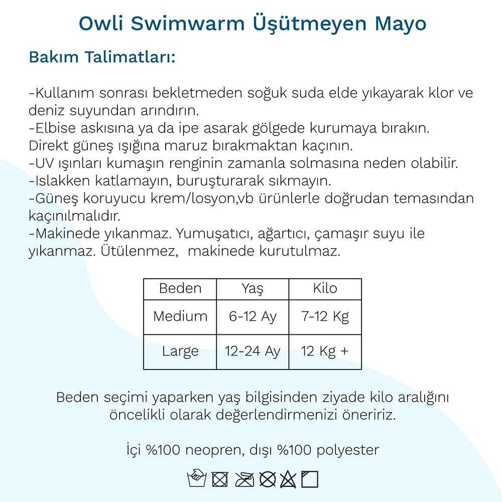 Bebekler sarmalanmayı ve sıcak kalmayı severler. Owli Swimwarm Üşütmeyen Bebek Mayosu bebeğinizi sarmalayarak güvenli ve keyifli bir yüzme deneyimi sunar.