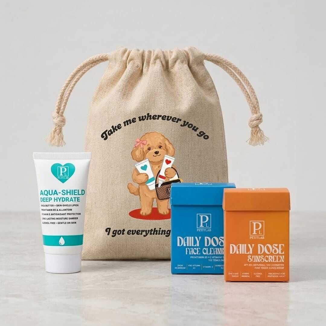 PetitLab Bez Keseli Seyahat Seti, günlük bakımın üç temel adımını — temizleme, nemlendirme ve güneş korumasını — pratik ve taşınabilir formatta bir araya getirir.