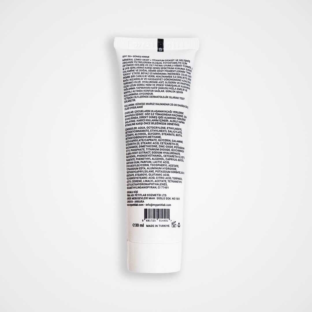 Hibrit mineral (çinko oksit + titanyum dioksit) ve gelişmiş organik filtrelerle formüle edilmiş, cildi beyaz iz bırakmadan koruyan SPF 50+ güneş kremi.